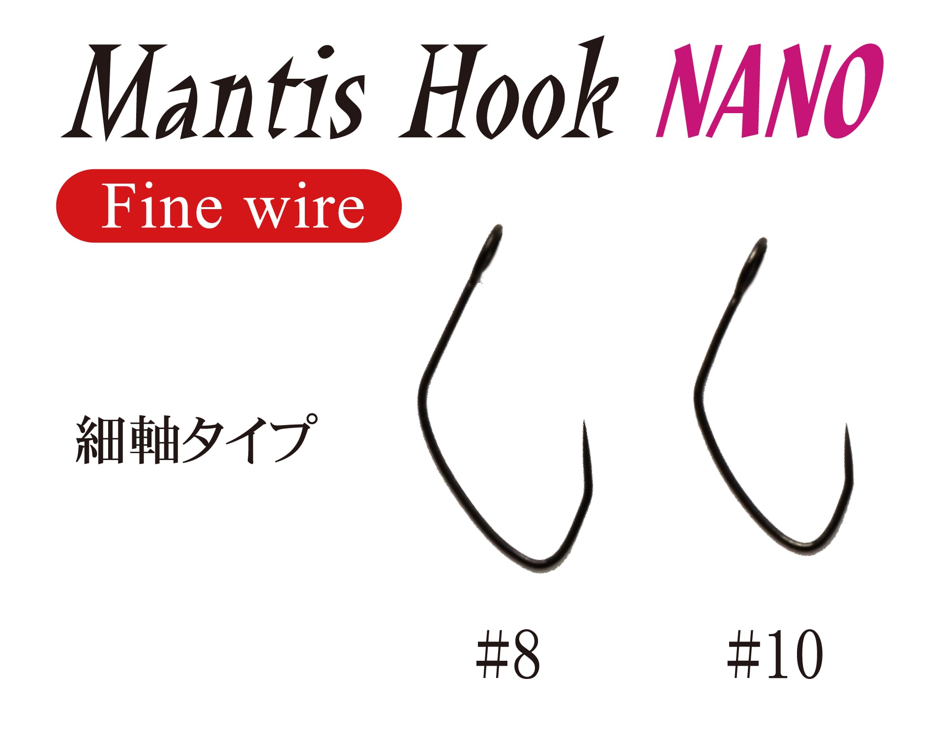 ナノスムースコート加工が施されたマンティスフックナノの細軸バージョン。耐久性の面では標準タイプと比べ劣ってしまうが、それと引き換えに得た掛かりやすさは驚異的である。浅いアタリがあっても触れたら掛かっていると言ってもよいほどの掛かりやすさを実現。繊細なアプローチを必要とするトーナメントシーンで高い評価を得ている。